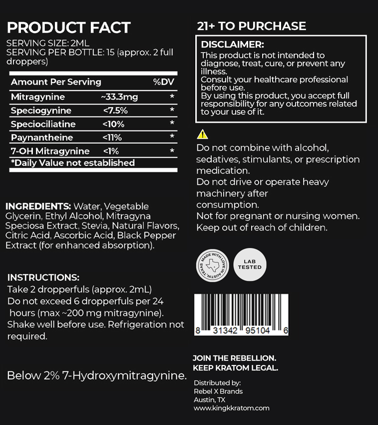 King K Platinum Liquid Kratom Extract is fortified with black pepper extract to accelerate onset and extend duration, creating a smooth yet powerful experience. Each 30ml dropper bottle delivers 1667mg of kratom extract with 500mg of mitragynine content, making Platinum one of the most potent liquid kratom extracts available.
